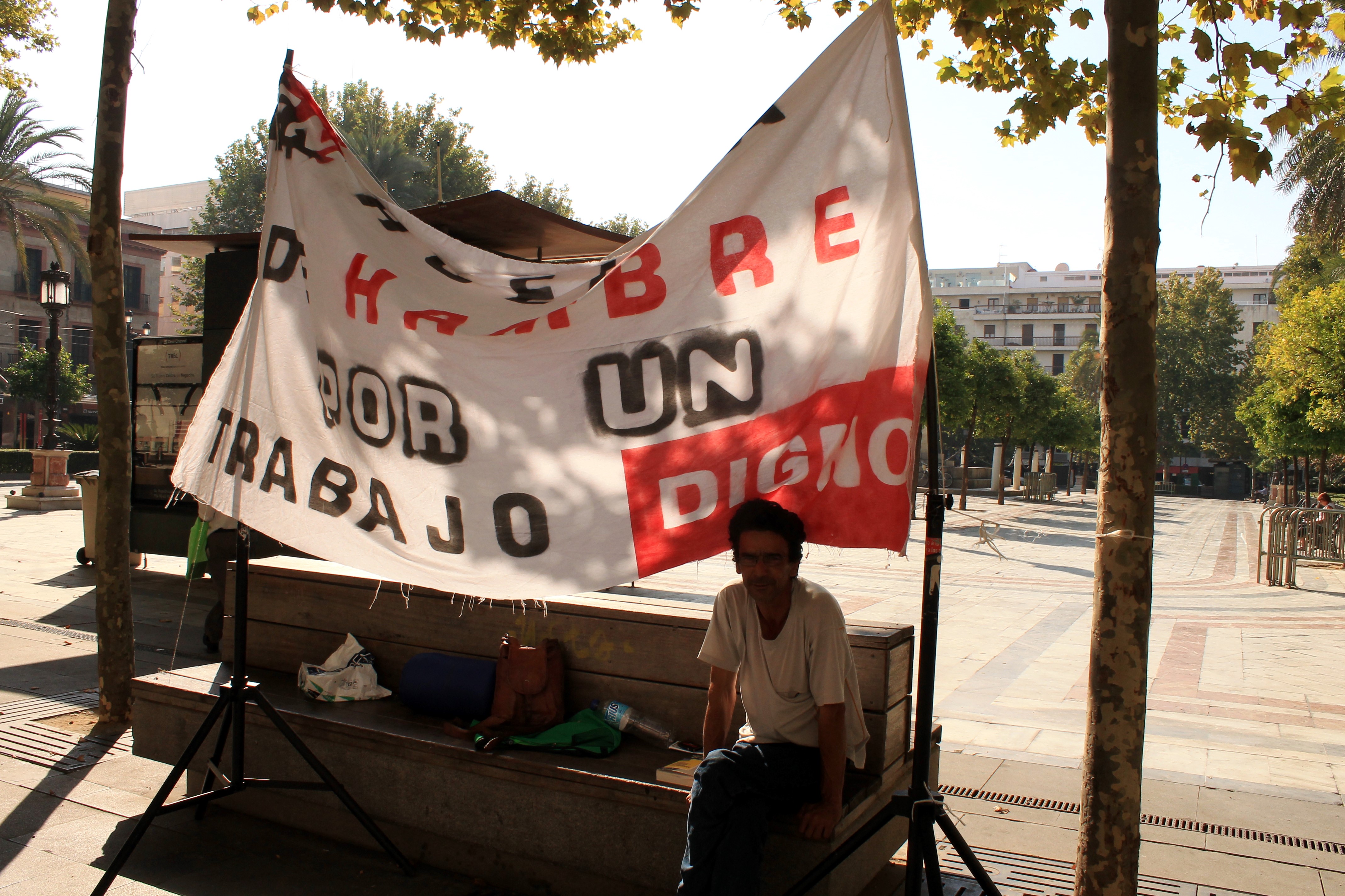 A la causa se han unido seis personas más entre Madrid, Zaragoza y Sevilla, pero reconoce que sus motivos son diferentes: “En Madrid están pidiendo la dimisión del gobierno, yo pido un incremento del trabajo”. Mané Flores, veterano en la militancia, aguarda cada día bajo el sol y la lluvia de octubre esperando una respuesta mientras intenta mantenerse activo y ocupado para no pensar demasiado en el hambre.